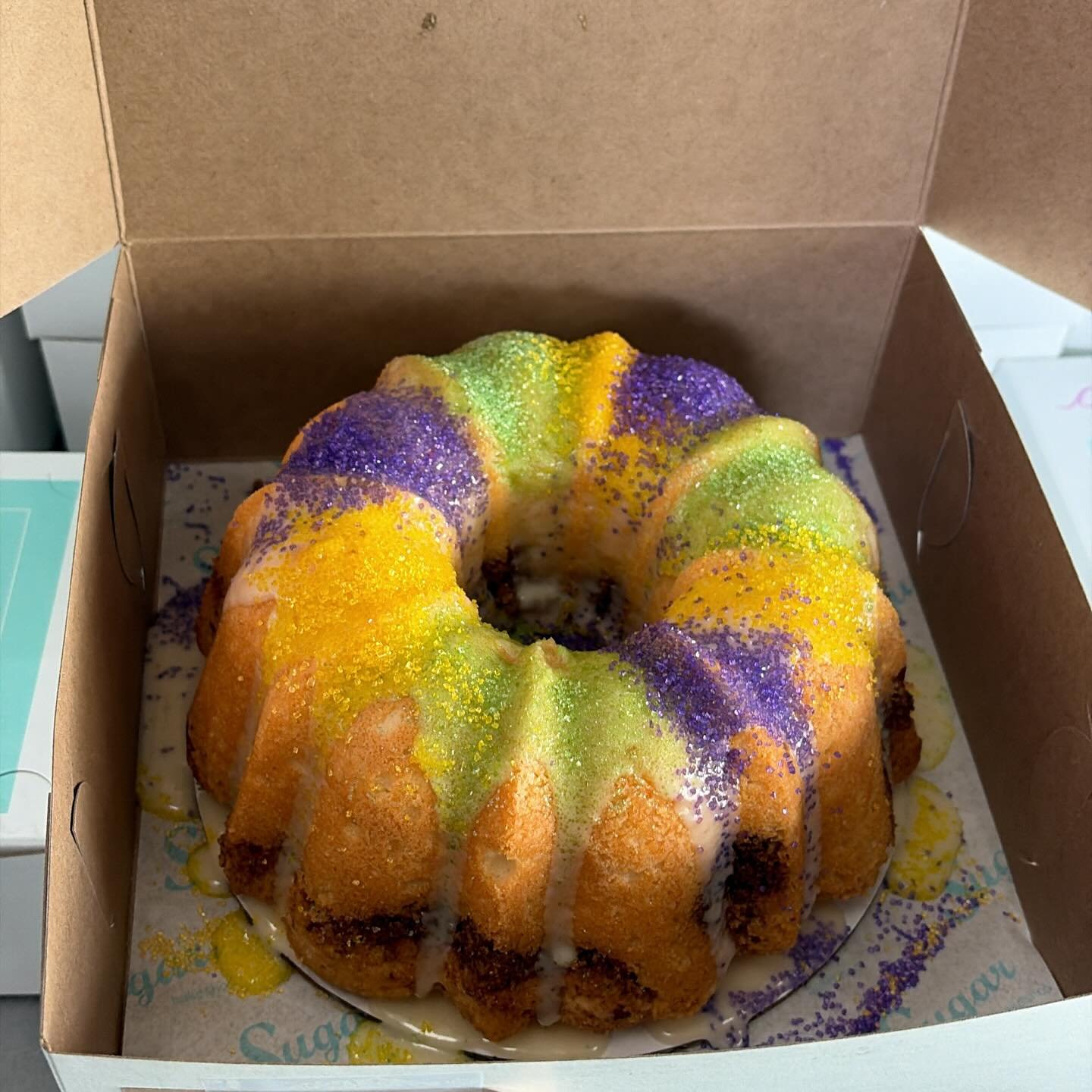 We’ll be making our version of the King Cake, complete with a little baby for you to hide under someone’s slice! This is a 1.5# vanilla poundcake with a brown sugar cinnamon pecan swirl, vanilla glaze, and the classic Mardi Gras sprinkles.